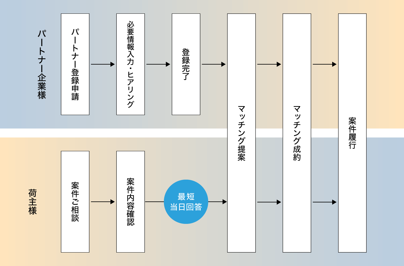 荷主様とパートナー企業様を繋ぎ、地域や業務内容に合わせた最適な価格での案件履行を実現します。