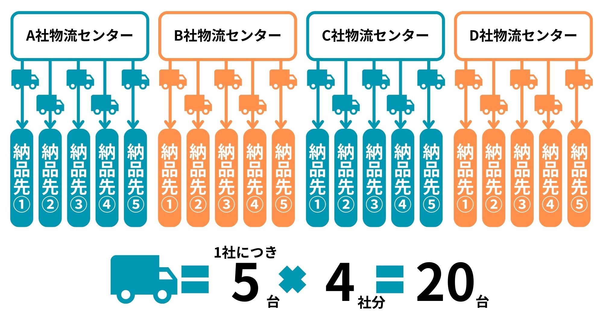まず、従来はディーラーへの配送を各社それぞれで行っていました。例えば、Aメーカーからディーラー5社に同時配送するなら、最低5台のトラックが必要であり、同じ配送をBメーカー・Cメーカー・Dメーカーの3社も行えば、5台×4社分=20台必要です。