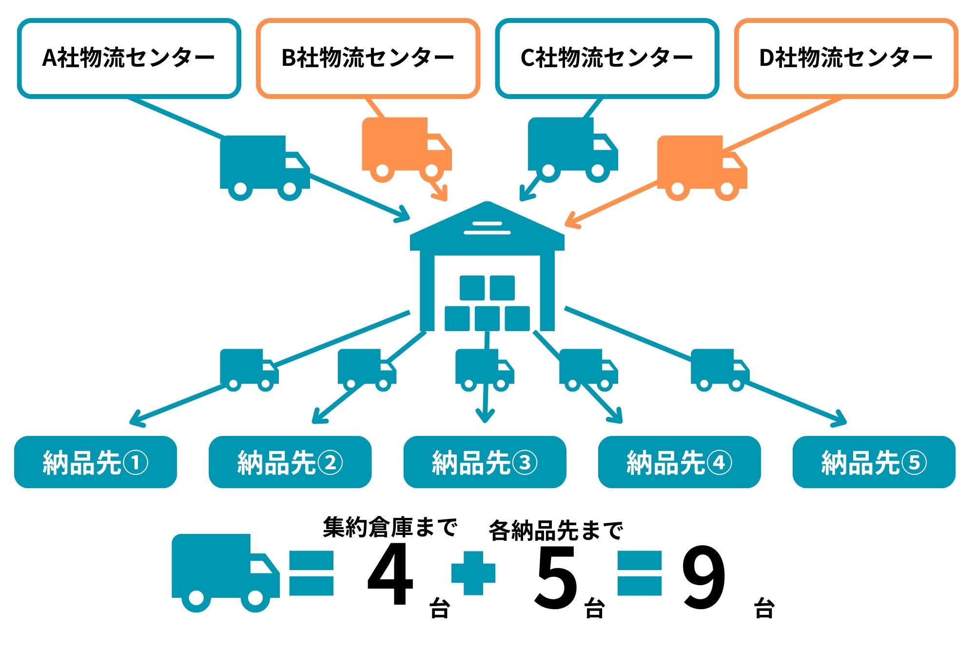 一方、今回の共同配送は各社物流センターから商材を1か所に集め、そこからそれぞれのディーラーに配送することになります。そのため、各社物流センターから集約倉庫に運ぶ分が4台、ディーラー5社へ配送する分が5台で、計9台。